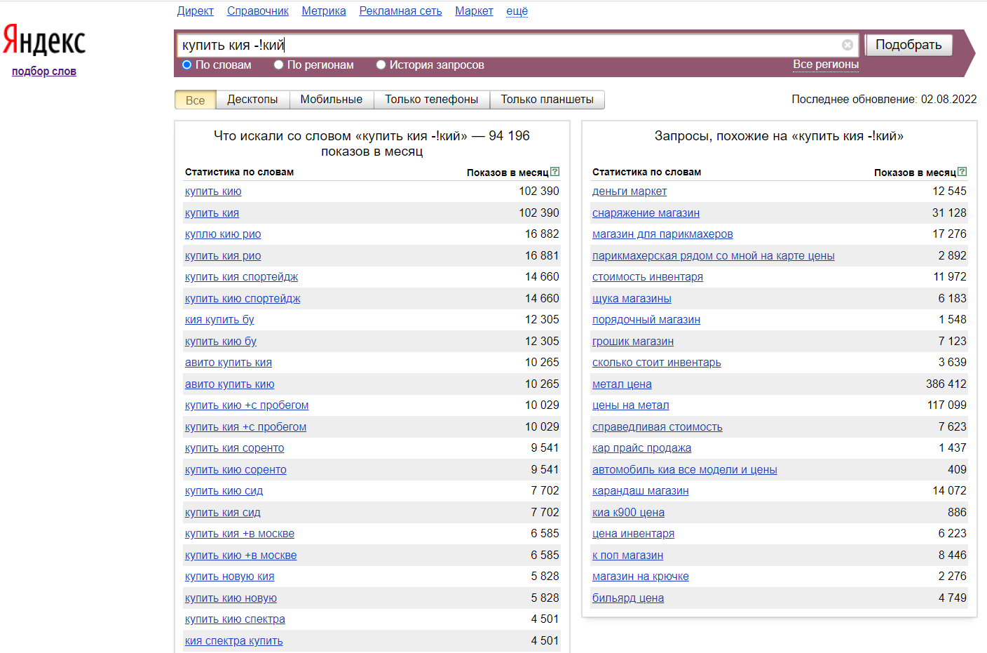 Чтобы исключить запросы, не совпадающие с тематикой продвижения, используйте оператор минус вместе с восклицательным знаком. Как в известном примере, вы не будете показывать рекламу бильярдного кия пользователям, которые интересуются покупкой машины Kia и ошиблись в правописании.