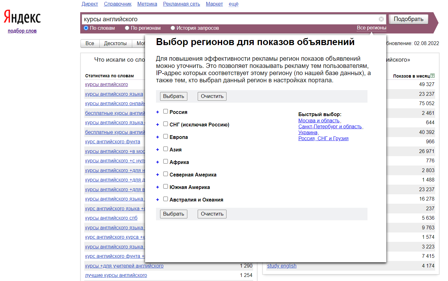 Для просмотра данных по разным регионам, нажмите «Все регионы». Откроется окно, где можно уточнить регион показов.