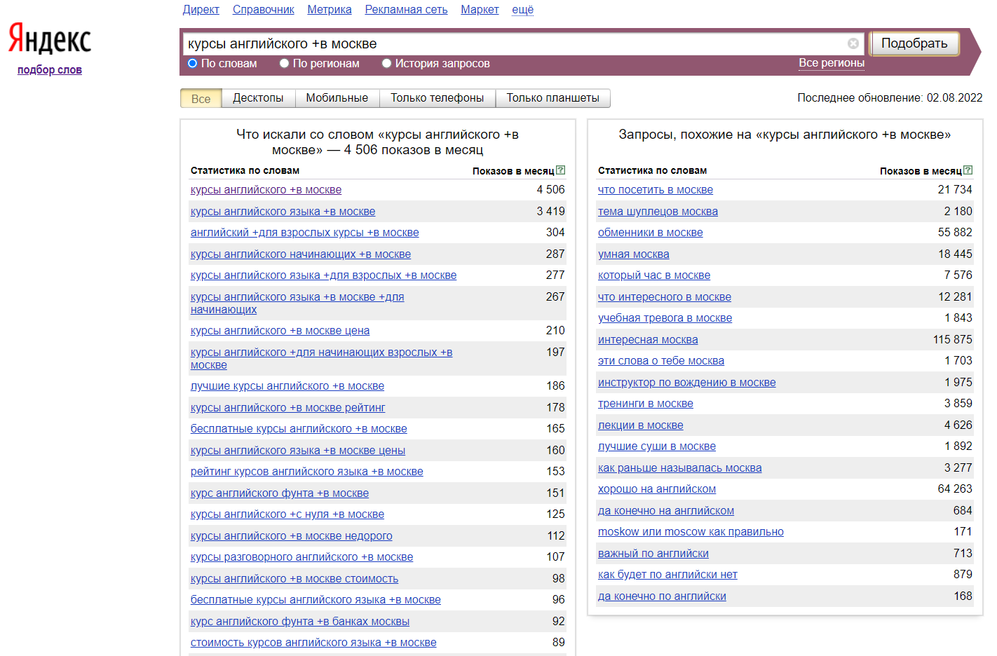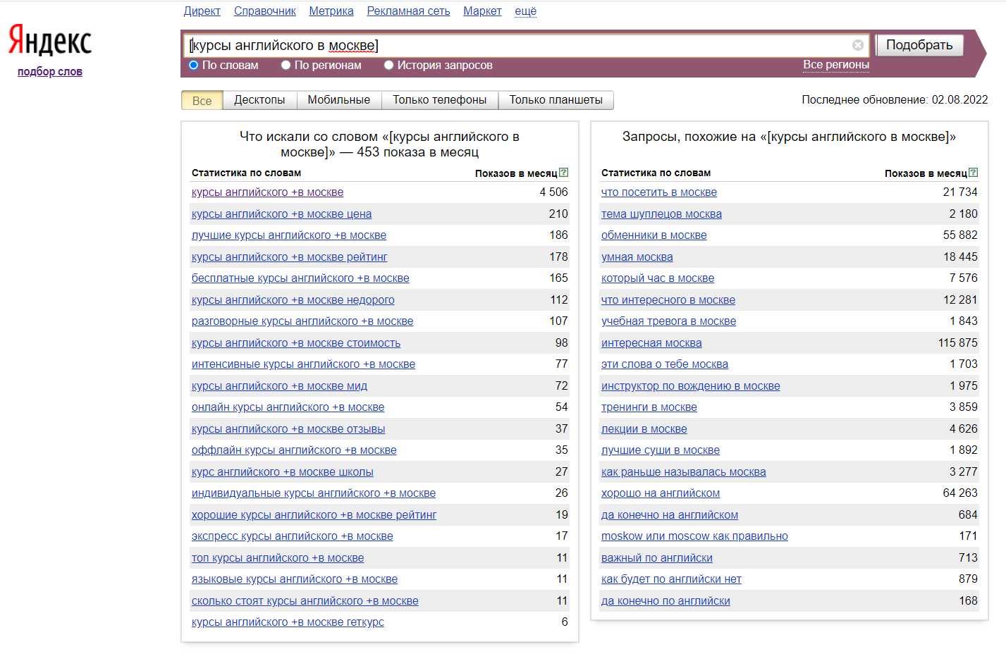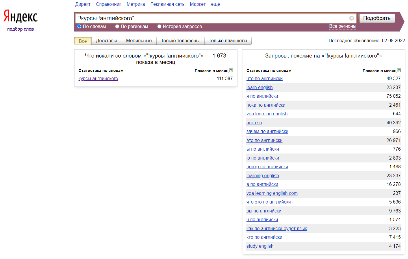 Кавычки фиксируют количество слов в запросе. Это помогает посмотреть, сколько раз пользователи вводили эту фразу. Система учитывает разный порядок слов и разные окончания. Повторяющиеся слова считаются за одно слово.