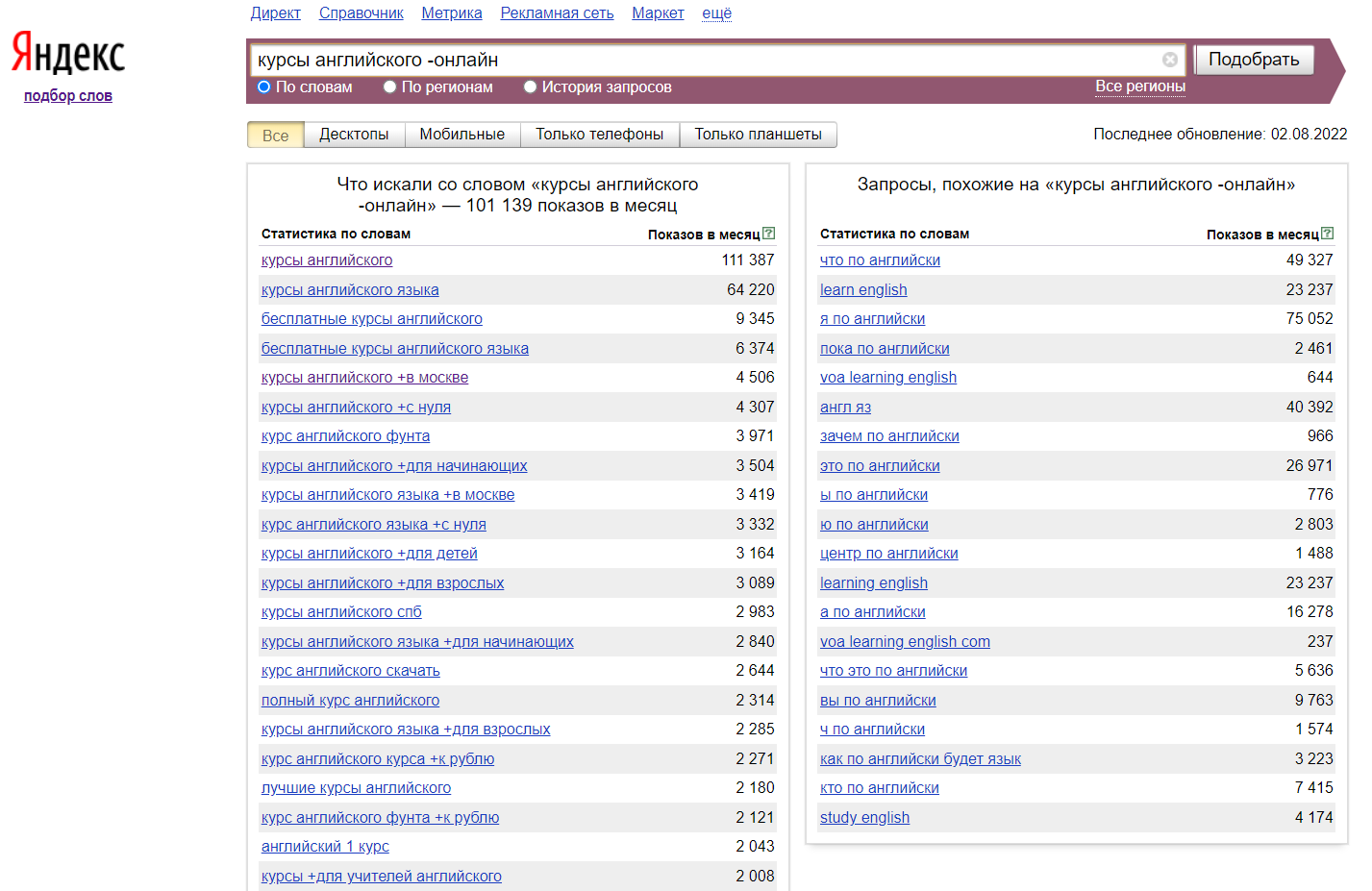 Сервис подбора слов помогает просматривать обобщенную статистику по запросам, а также оценивать частотность в зависимости от различных факторов. В Wordstat также есть набор операторов, с помощью которых можно узнать реальное число запросов для определенной формы слова или фразы.