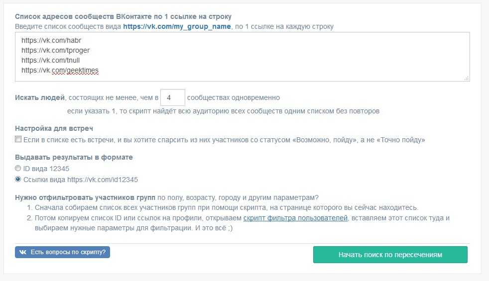 Сервис помогает отследить пересечения пользователей в сообществах, затем отфильтровать получившуюся базу по геолокации, месту обучения и другим параметрам. Можно отследить активность пользователей на стене и в обсуждения, лайки и репосты к постам.