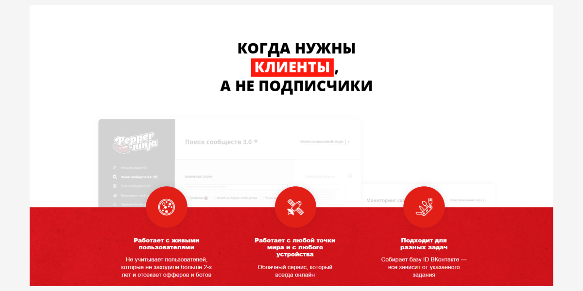 Еще одна примечательная особенность парсера Pepper.Ninja — наличие ряда уникальных решений, призванных повысить точность таргетинга и максимально ускорить работу со списками. Речь идет о таких инструментах как «Быстрый парсинг», «Периодические задания и мониторинг», «Поиск сообществ 3.1», «Авто Сегмент», «Поиск пользователей Instagram в ВКонтакте», «Pepper.Panel», «Кто мой клиент 3.0». Работу с Pepper.Ninja рассмотрим на примере последнего инструмента.