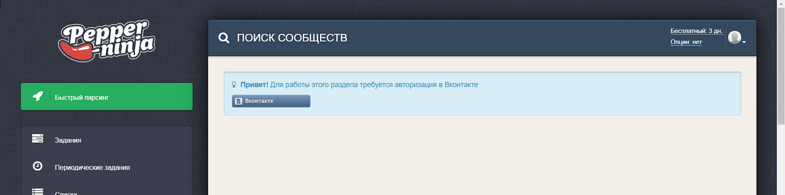 3. Дополнительно авторизуйтесь в аккаунте Вконтакте. Это необходимо, чтобы спарсить аудитории Вконтакте в Pepper Ninja