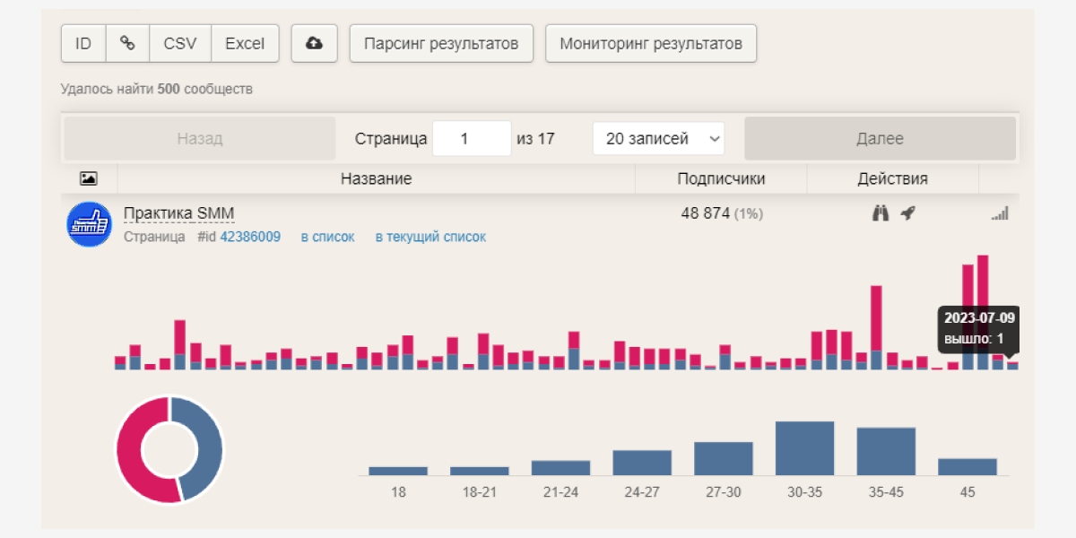 Сервис Pepper.Ninja дает возможность проанализировать не только личные страницы пользователей сети, но и сообщества. Парсеры из этой группы более специализированы. Они выдают компактные выборки. С их помощью можно выгрузить перечень групп, администрируемых пользователями, относящимися к ЦА, аудиторию чатов (то есть происходит выгрузка всех клиентов, когда-либо писавших сообщения в сообщество маркетолога), собрат аудиторию, подписавшуюся на то или иное мероприятие.