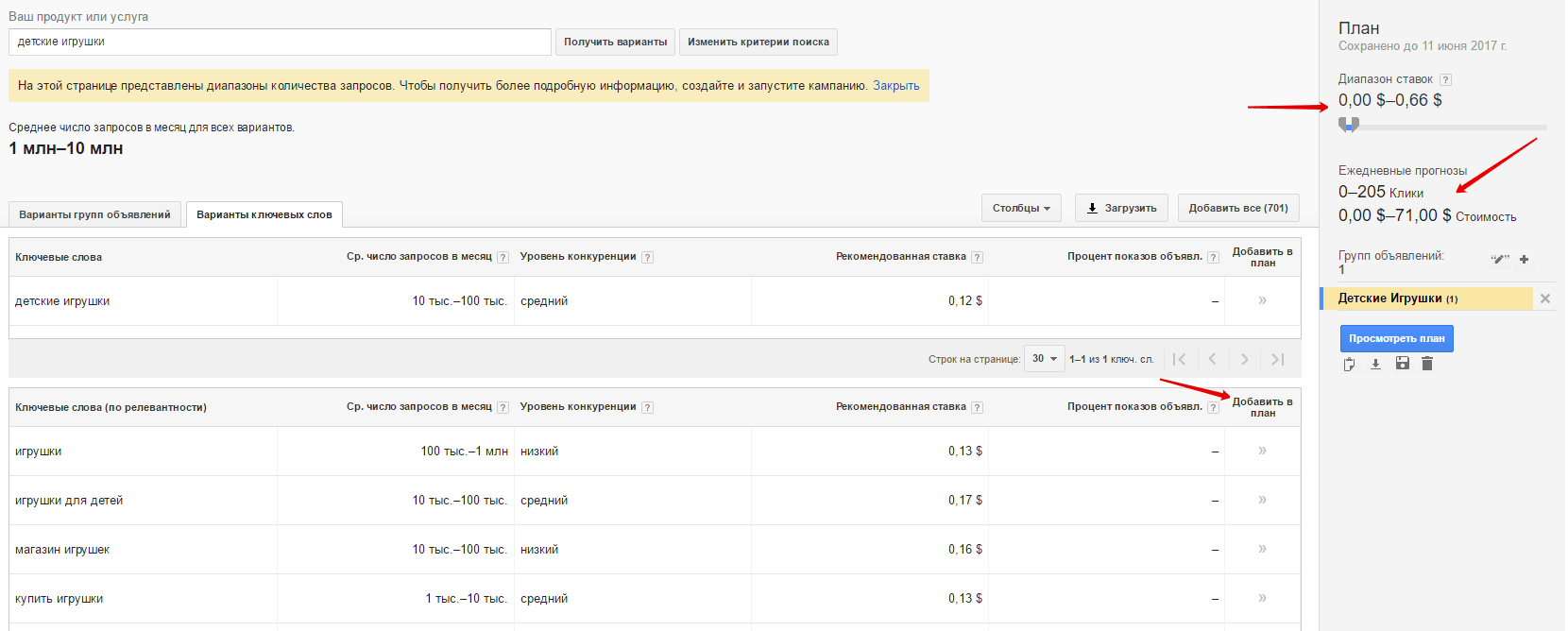 Обратите внимание, что это только прогнозируемая ставка — в реальности она будет другой. Но понять “среднюю температуру по больнице” поможет.. Сразу из таблицы слова можно добавить в план
