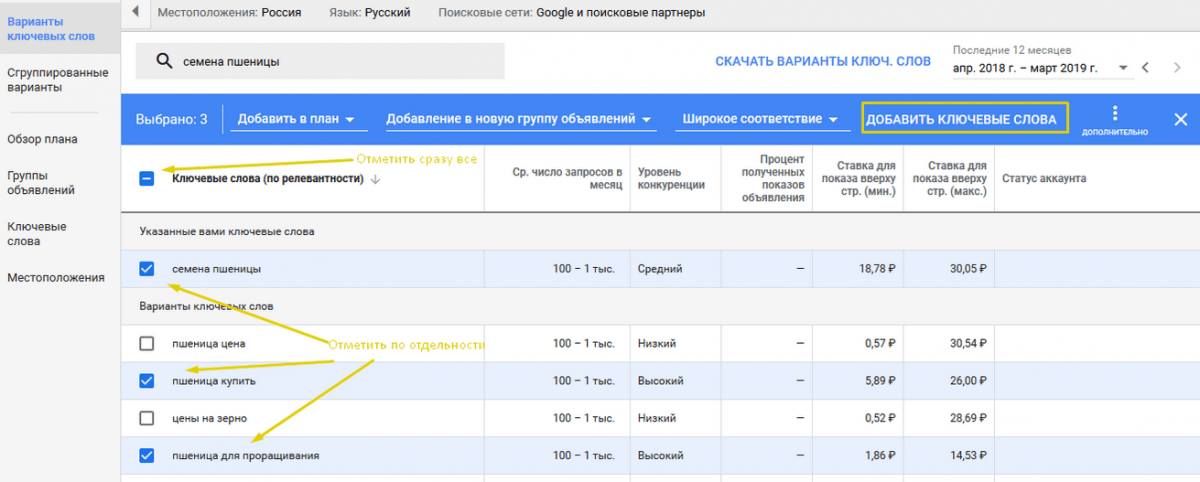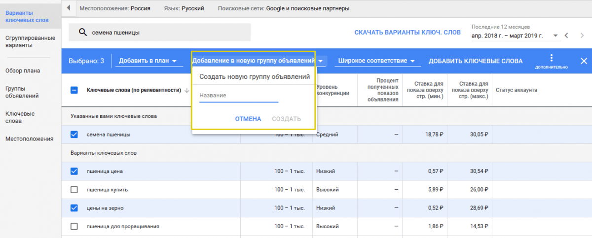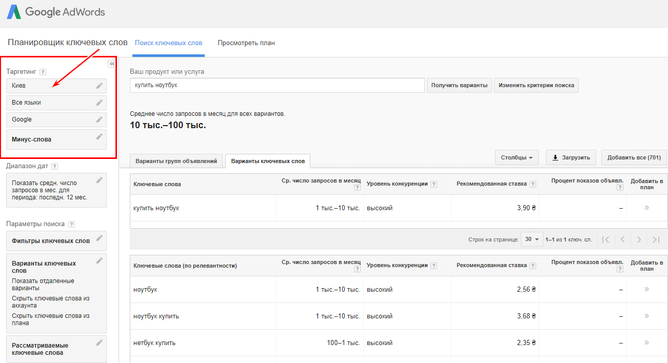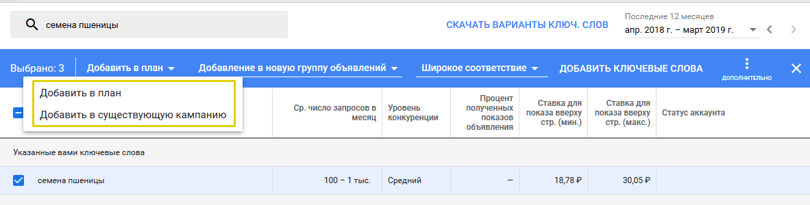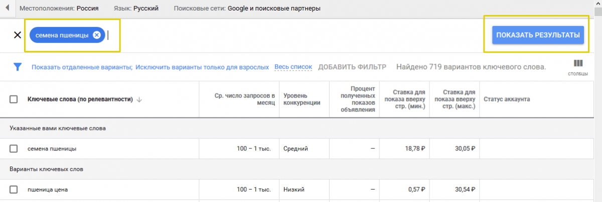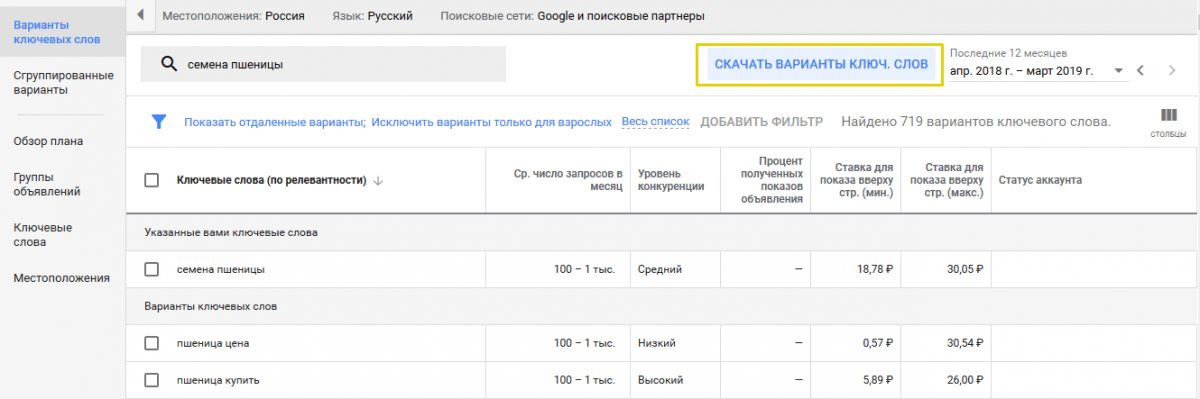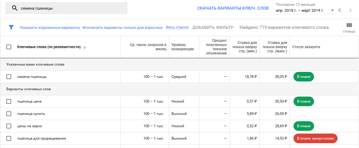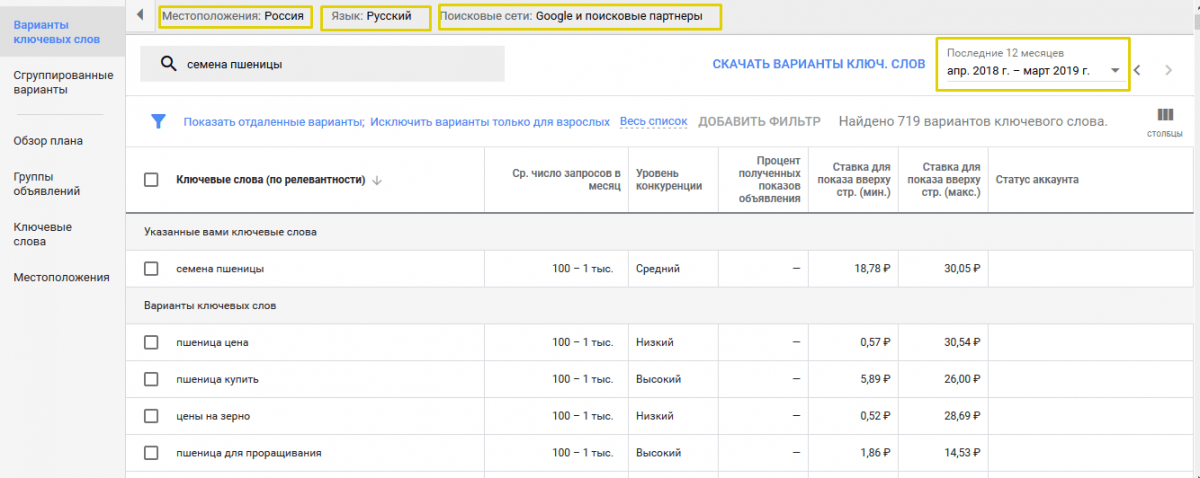 (на основе показателей за последние 12 месяцев), уровень конкуренции и рекомендуемая ставка. Это крайне полезная информация для запуска рекламной компании в Google Adwords