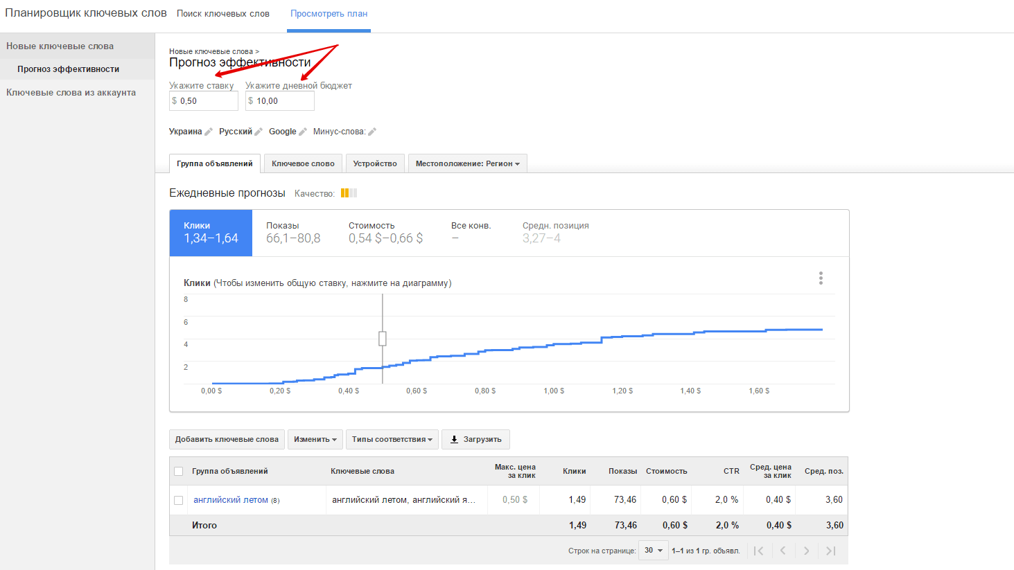 И сразу будет виден Ежедневный прогноз по кликам и стоимости в зависимости от выбранной ставки.