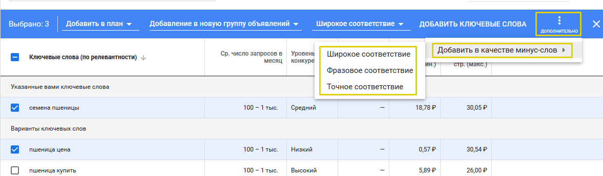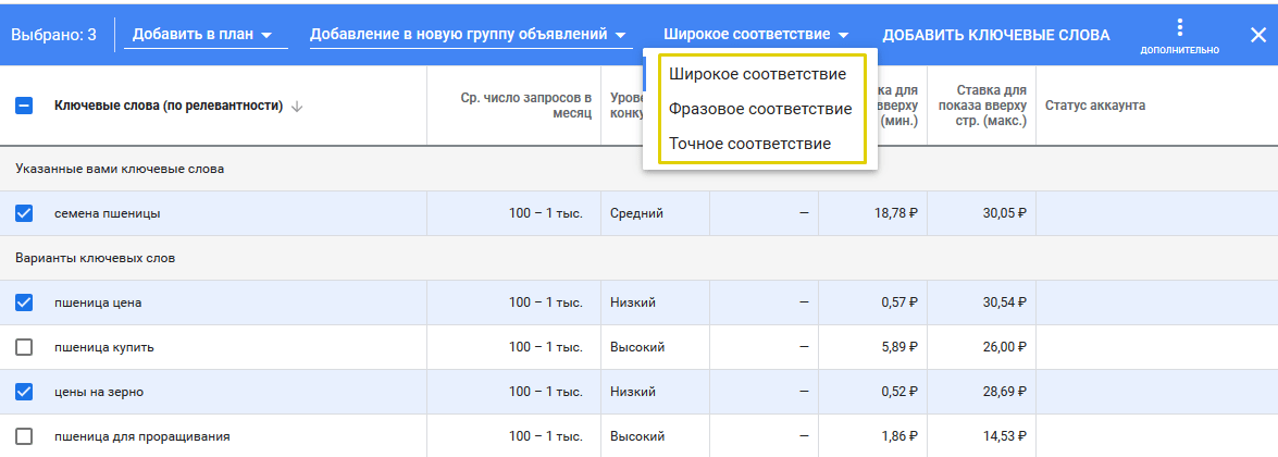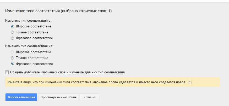 Нужно знать очень важный нюанс подбора ключевых слов в Google. По умолчанию для всех ключевых слов стоит широкое соответствие, то есть, ваше объявление будут показывать по различным словоформам, что не всегда допустимо. Изменить это можно в настройках: