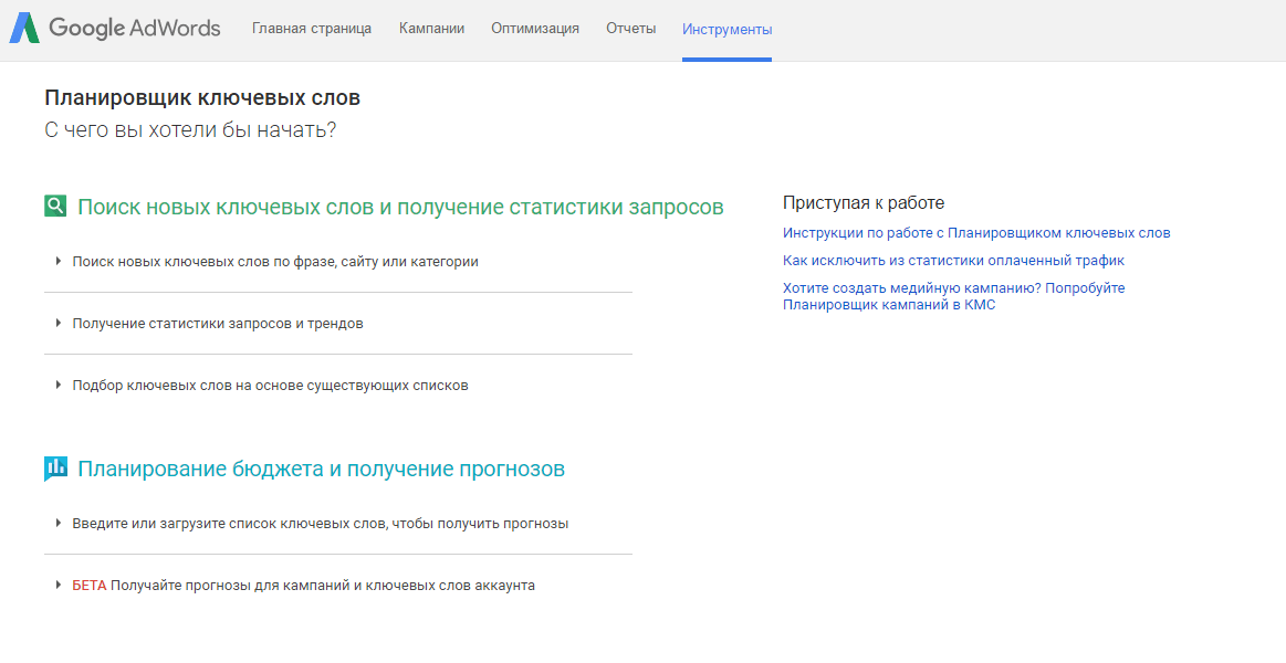 Планировщик ключевых слов — это бесплатный инструмент, который может помочь при запуске рекламной кампании, при ее оптимизации, а также для того, чтобы оценить эффективность созданных списков ключевых слов или составить новый список. Войти в него можно также