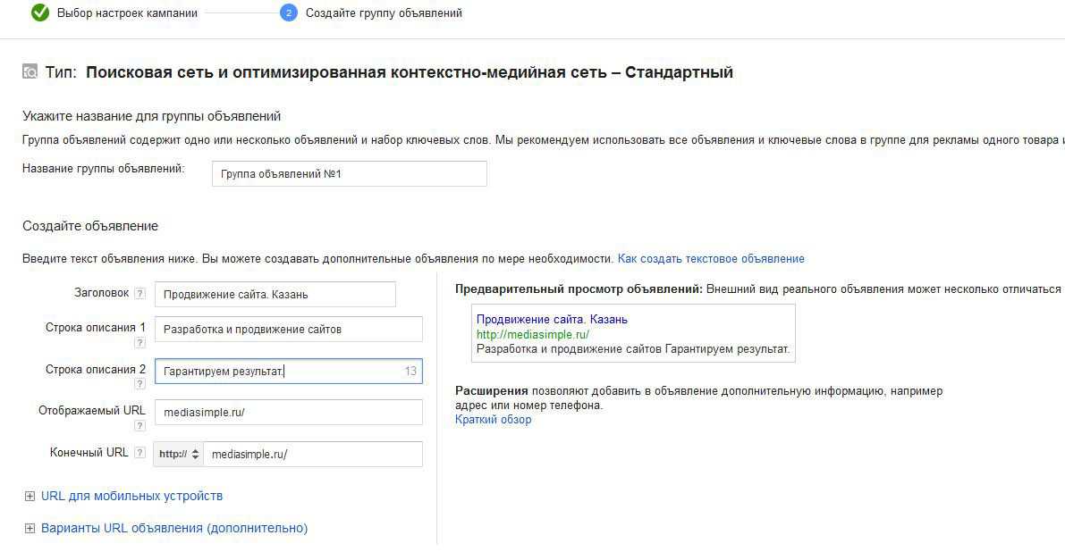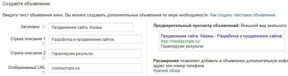 Первоначальные настройки не должны вызвать особых вопросов, на скриншоте видно заполненные поля, также обратите внимание на то, что справа доступен предпросмотр вашего объявления