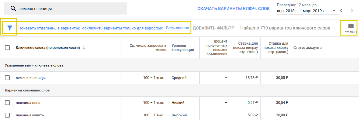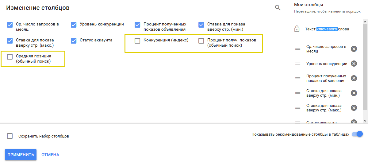 Столбцы, которые можно отобразить (помимо существующих по умолчанию): средняя позиция, конкуренция и процент полученных показов по ключевому слову.