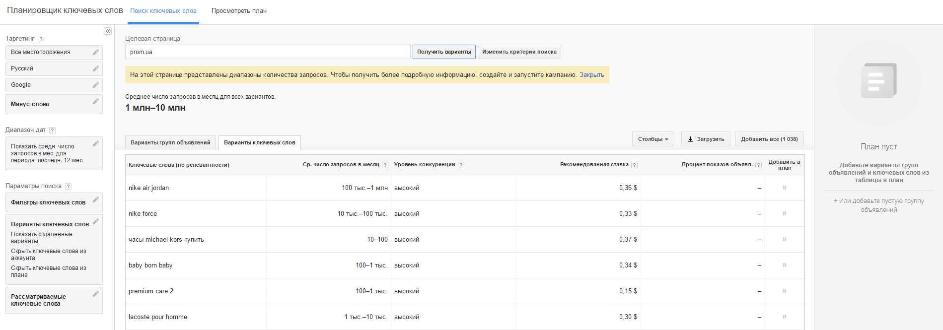 1. Планировщик не подходит для подбора ключевиков под широкий ассортимент товаров/услуг