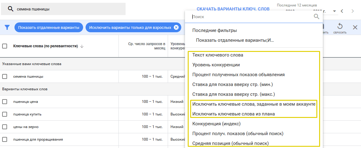 Такие фильтры, как «Исключить ключевые слова, заданные в моем аккаунте» и «Исключить слова из плана» позволяют исключить пересечение новых добавляемых ключевых слов с теми, которые уже есть в аккаунте, и теми, которые уже добавлены в план.