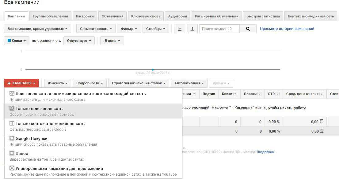 Поисковая сеть – ваши объявления будут показывать только в поисковой выдаче Google, а также у партнеров, которые используют поиск компании;