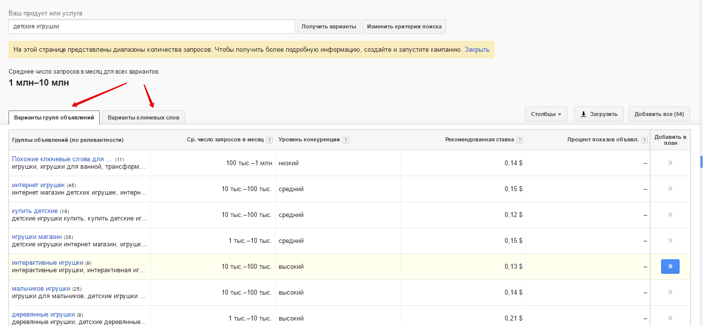 В верхнем меню таблицы доступны две вкладки: Варианты групп объявлений и Варианты ключевых слов. В Вариантах групп система сама группирует похожие запросы в группы, из которых потом можно делать объявления