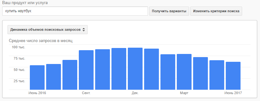 На открывшейся странице заходим в «Поиск новых ключевых слов» и вводим запрос, по которому хотим проверить частотность. Пусть это будет «купить ноутбук» и внизу нажимаем «Получить варианты».
