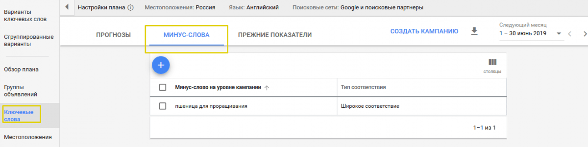 На вкладке «Минус-слова» прогноза по ключевым словам содержится список добавленных минус-слов. С помощью кнопки «+» можно добавить любые минус-слова дополнительно.