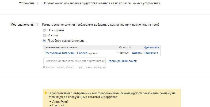 Тип устройств, на которых будут отображаться ваши объявления, на этом этапе указать нельзя, поэтому вводите свое местоположение. Как видно, можно не только добавить определенный регион, но и исключить его. Ниже Google предлагает мне показывать рекламу, в том числе и на англоязычных сайтах, этим предложением я не воспользуюсь, мне нужен только русский язык.