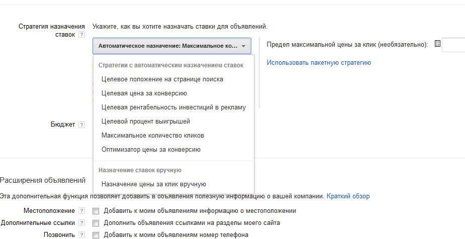 Видно, что есть шесть автоматических стратегий, которые будут сами назначать цену, а вы сможете указать лишь дневной бюджет. Также есть возможность назначать цену за клик вручную, лучше выбрать именно эту опцию, что я и сделаю в своем примере. Дело в том, что автоматические стратегии не позволят вам оптимизировать рекламную кампанию, ручная настройка почти всегда гораздо выгоднее. О стратегии ставок я еще расскажу ниже.