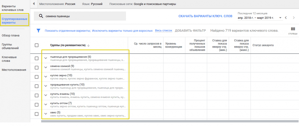 Заметим, что кроме закладки «Варианты ключевых слов», есть и «Сгруппированные варианты». В ней вся выдача представляется в группах, собранных по составу слов.