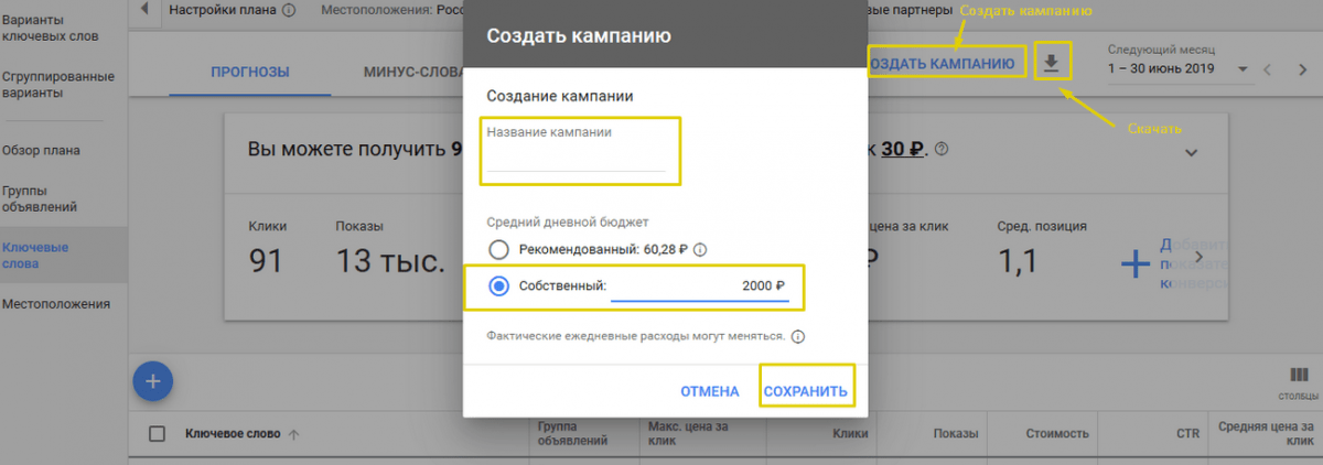 Для дальнейшей работы с ключами их можно либо скачать в Excel (с помощью значка скачивания) или продолжить работу онлайн в «Эдвордс», нажав на кнопку «Создать кампанию».
