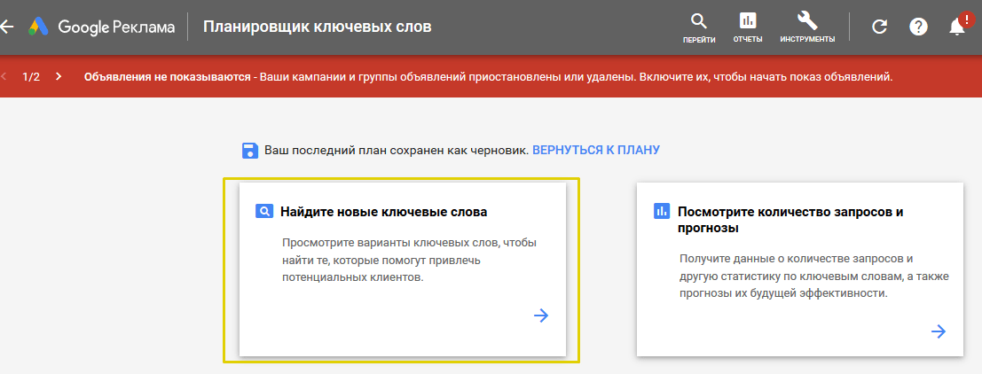Если у Вас была ранее запущена рекламная компания, то дополнительную информацию по статистике запросов в Google Adwords, можно посмотреть промониторив по каким запросам была показана ваша реклама. Для этого, зайдите в раздел «Отчёты»
