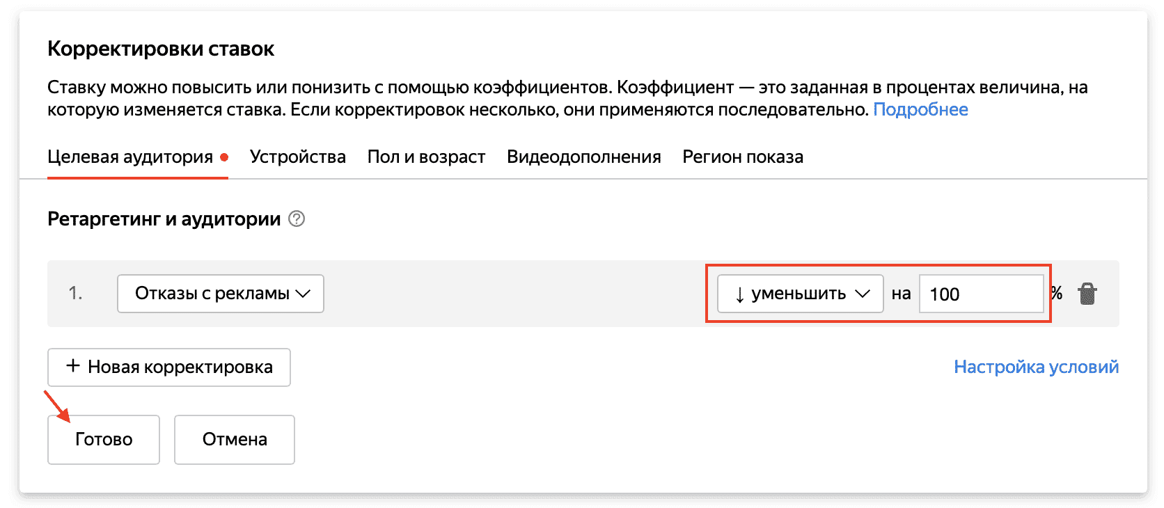После сохранения, ныряем в параметры нужной нам кампании и находим там “Корректировку ставок”, где выбираем наше сохраненное условие и делаем корректировку минус 100%
