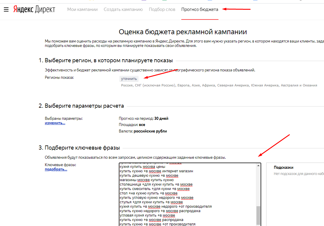 В завершении работы по настройке кампании в РСЯ необходимо зайти в «Расчет бюджета» и ввести собранные ключи и предполагаемые минус-фразы. Алгоритм проанализирует настройки и выдаст примерный расход при определенных ставках.