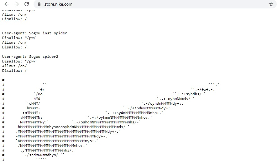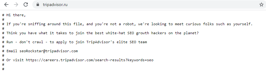 Содержимое robots.txt может включать не только список директив для обращения к поисковым системам. Поскольку файл является общедоступным, некоторые компании подходят к его созданию творчески и с юмором. Иногда там можно обнаружить картинку, логотип бренда и даже предложение о работе. Реализация нестандартного robots.txt осуществляется с помощью комментариев # и других символов.