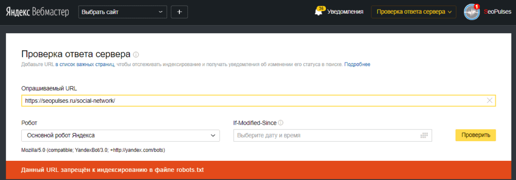 Также если воспользоваться сервисом «Проверка ответа сервера» от Яндекса также будет указано, запрещен ли для сканирования документ при попытке обратиться к нему.