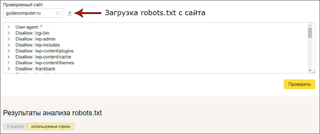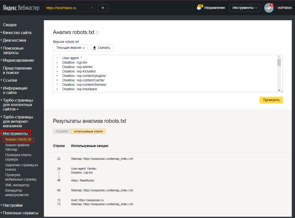 В Яндекс.Вебмастер в разделе «Инструменты→ Анализ robots.txt» можно увидеть используемый поисковиком свод правил и наличие ошибок в нем.