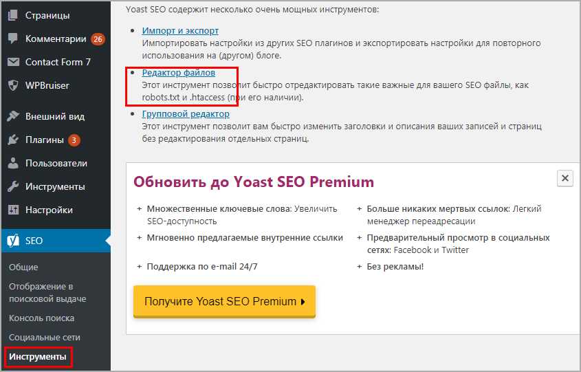 Знаменитый плагин Yoast SEO предоставляет возможность добавить и изменить robots.txt из панели WordPress. Причем созданный файл появляется на сервере (а не виртуально) и находится в корне сайта, то есть после удаления или деактивации роботс остается. Переходим в Инструменты > Редактор.