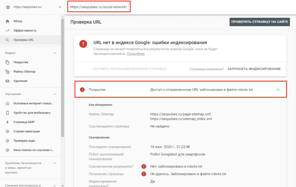 Однако, если ввести заблокированный URL в страницу поиска в новой Google Search Console (или запросить ее индексирование), то можно увидеть, что страница заблокирована в файле robots.txt.