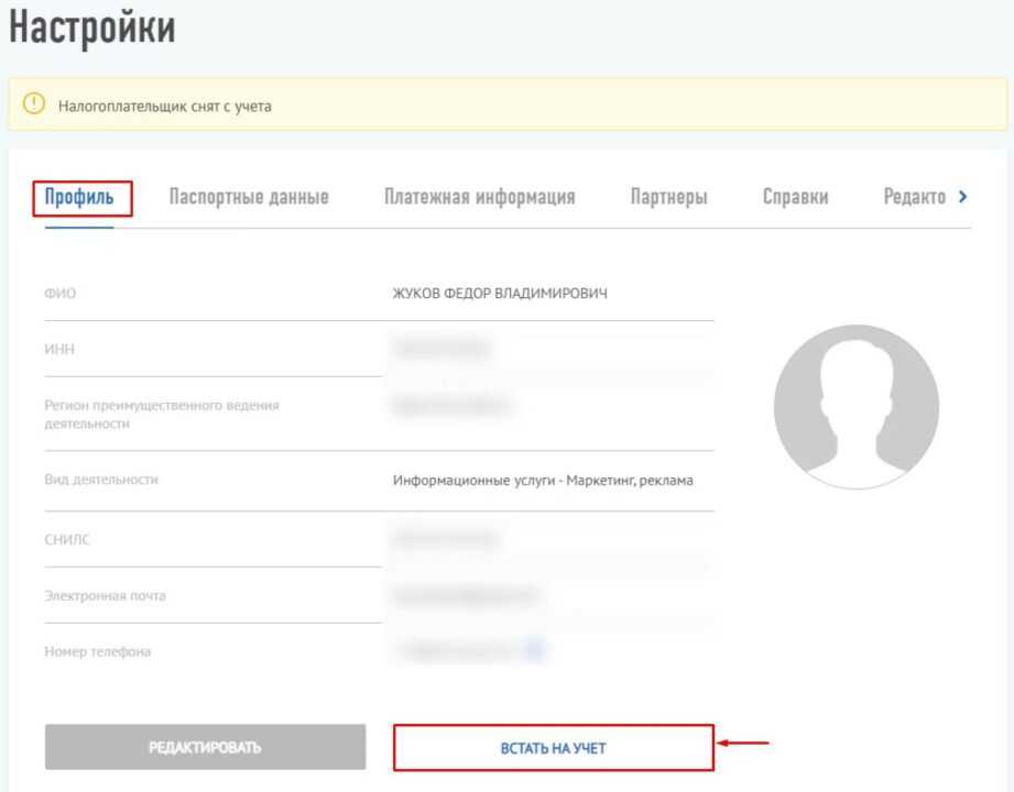 На вкладке «Профиль» проверьте свои данные и внизу нажмите кнопку «ВСТАТЬ НА УЧЕТ».