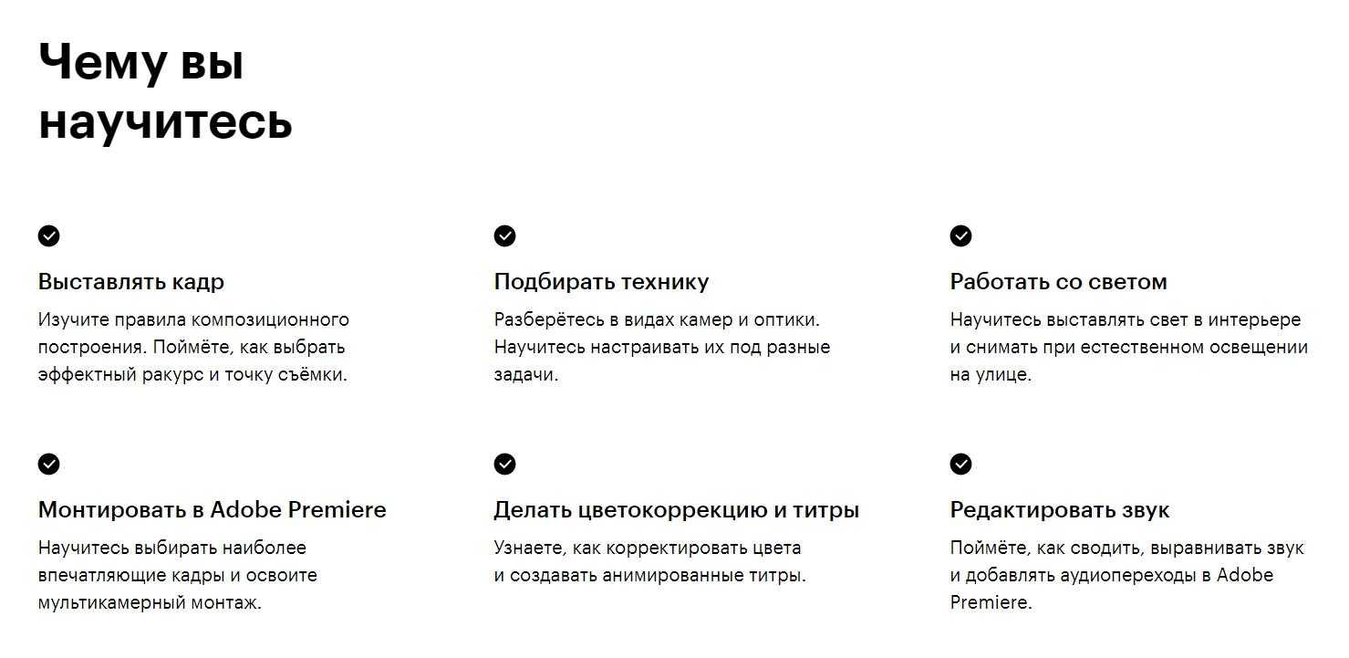 На курсе доступно шесть обучающих модулей. Данная программа подходит новичкам, начинающим режиссерам, монтажерам или видеографам. Обучаются на курсе посредством вебинаров, видеоколлекций в Интернете. После обучения получаете навыки по профессии.