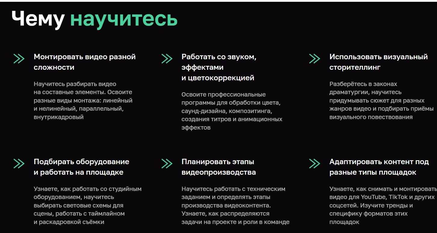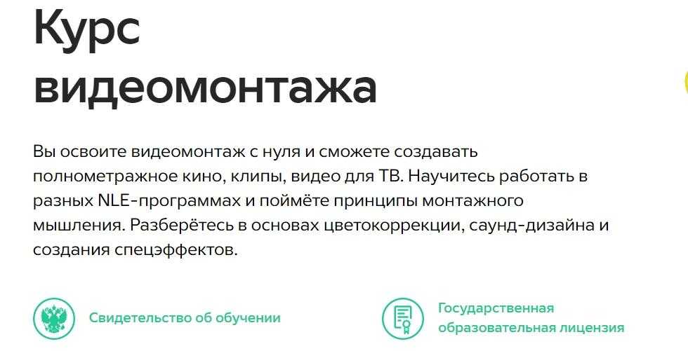 Данный курс будет нужен начинающим видео-блогерам, видеографам, тем, кто желает освоить профессию и зарабатывать деньги на создании контента. Что вы получите? Создадите 7 проектов для дипломного портфолио – небольшие видео, разного вида монтажей и промороликов. Как проходить курс? Смотрите видео внимательно. После просмотра выполняете задания. Поддерживайте обратную связь с кураторами. Есть помощь в трудоустройстве, как и на курсах выше.