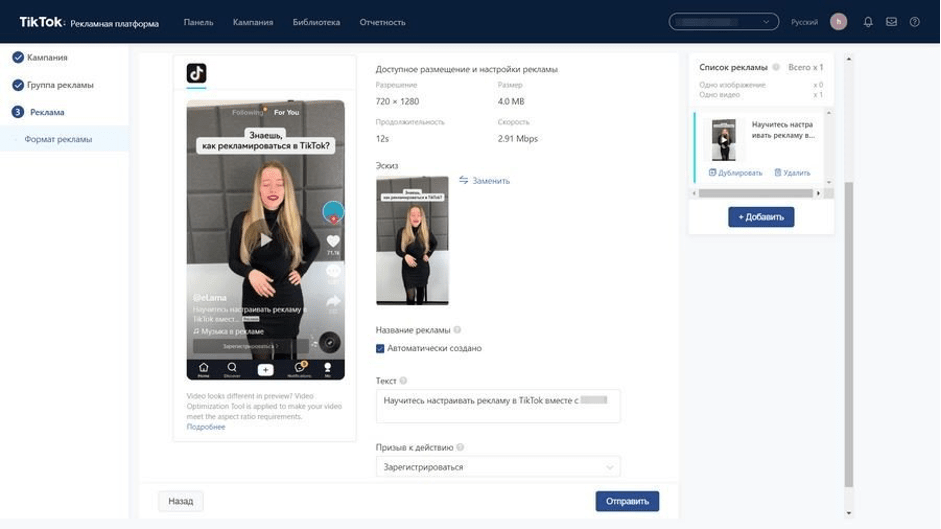 Просто выберите местом размещения РСЯ, загрузите креативы, придумайте название и описание. А потом запускайте рекламу. Но учтите, что ее будут показывать не только в TikTok, но и на всех рекламных площадках в сети. Если хотите размещаться именно там, есть две хитрости: