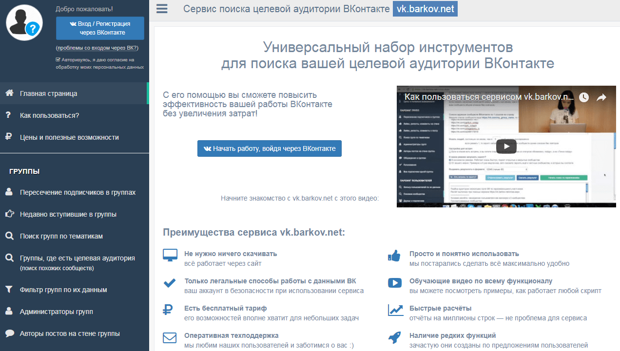 Этот вариант парсера аудитории удобен для новичка, который хочет «просто попробовать», так как бесплатный тариф отличается от платного только количеством данных в результатах, а набор функций тот же. Есть множество функций как для поиска простых участников ВК, так и для поиска определенных групп и их администраторов.
