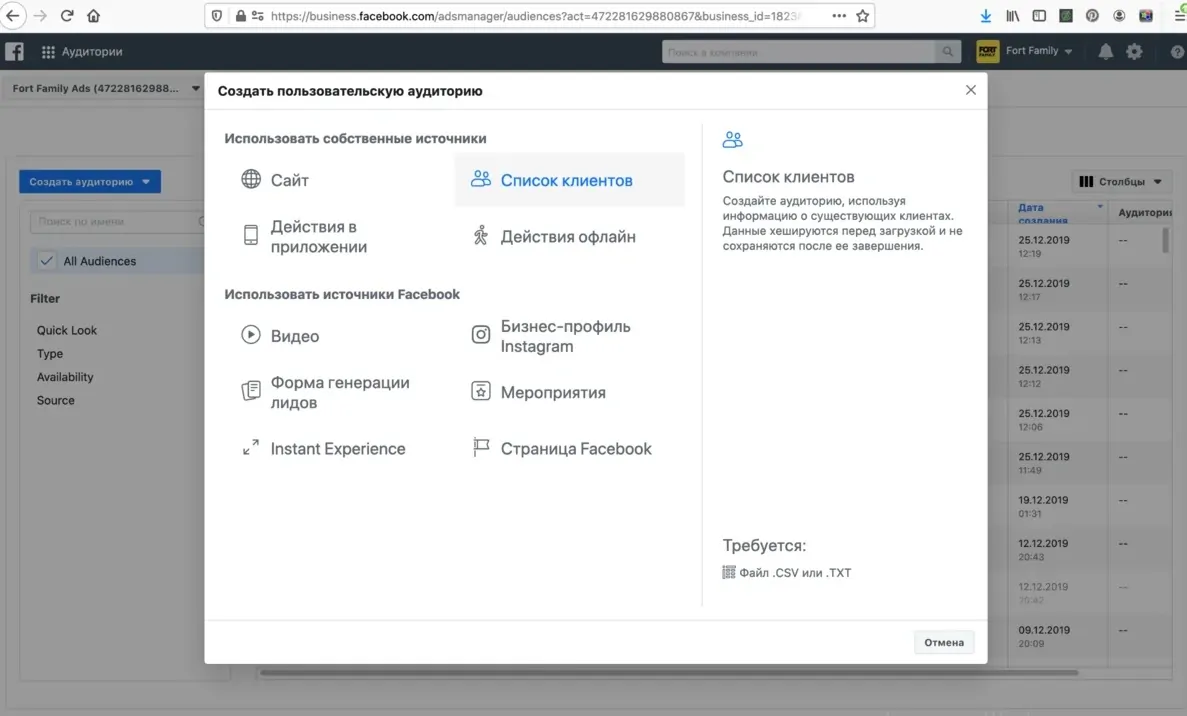 - Загрузить базу в рекламный кабинет Фейсбук. Если подписчики парсились у разных конкурентов, то полученные данные лучше объединить в одну базу.
