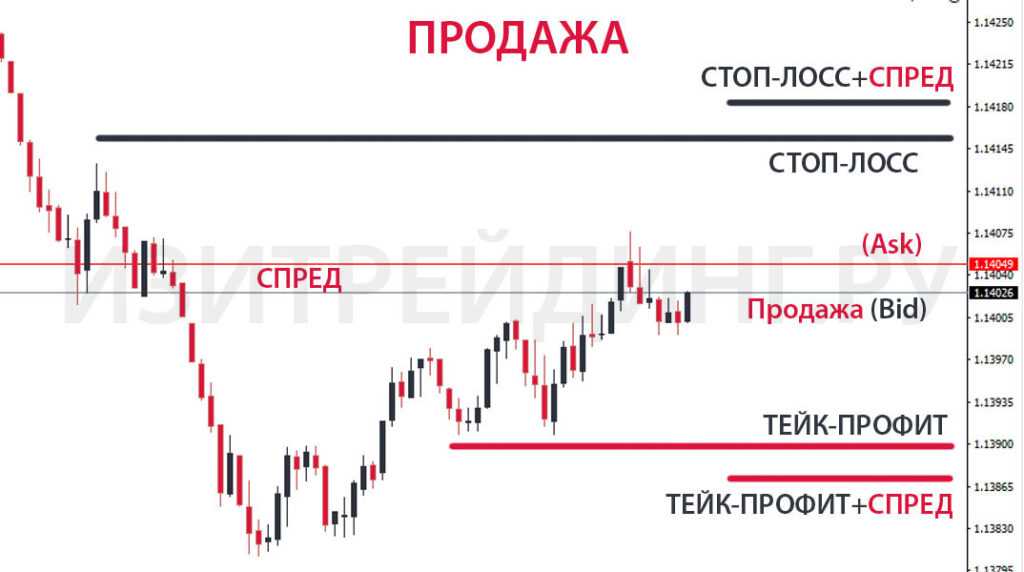 При продаже. Если вы открываете шорт позицию, стоп-лосс нужно поднимать на уровень спреда плюс 1-2 пунка (погрешность брокера). Тейк-профит на то же значение нужно опустить ниже.
