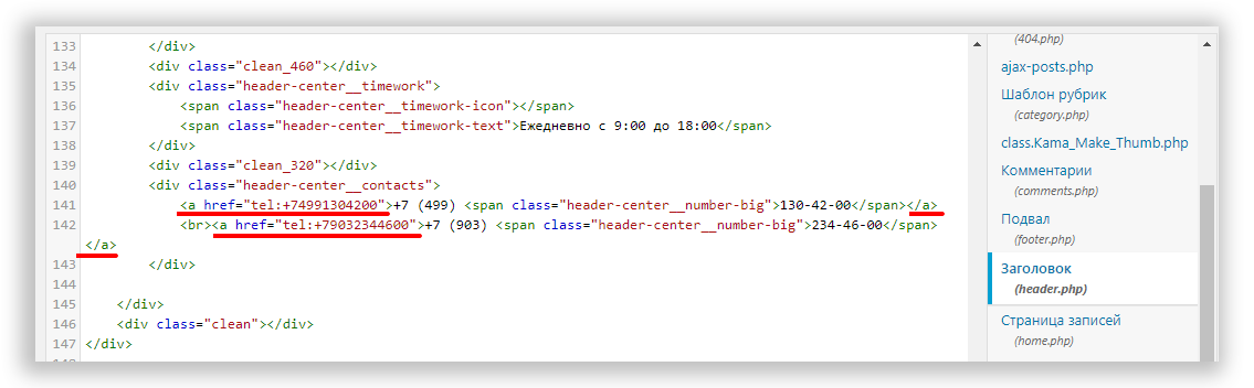 Метод создания кликабельной ссылки на движке WordPress аналогичен пункту «HTML-код сайта» данной статьи. Главная задача в том, чтобы найти нужный фрагмент кода в админ-панели.