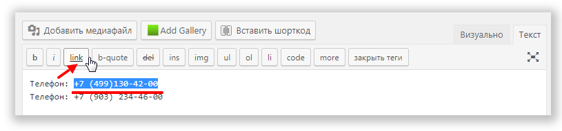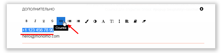 Находим нужный блок, выделяем телефон и нажимаем иконку “Ссылка”: