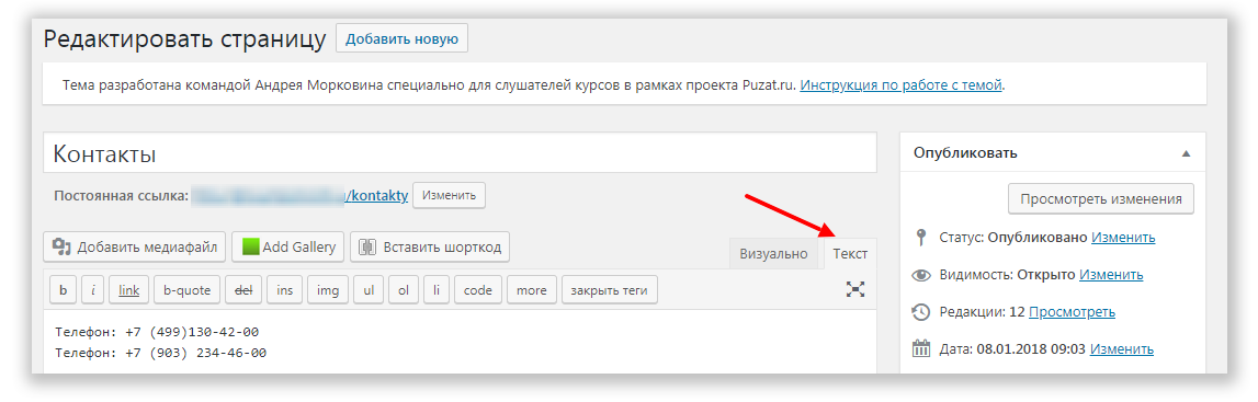 - Переходим в редактор кода, нажав на вкладку “Текст”: