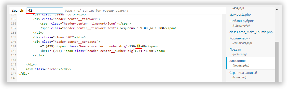 - В коде находим телефон. Для быстрого поиска кликнете левой кнопкой мыши на поле с кодом и нажмите комбинацию на клавиатуре: “Ctrl” + “F”. Затем введите несколько цифр телефона и нажмите “Enter”. Нужный фрагменты станут выделены желтым цветом.