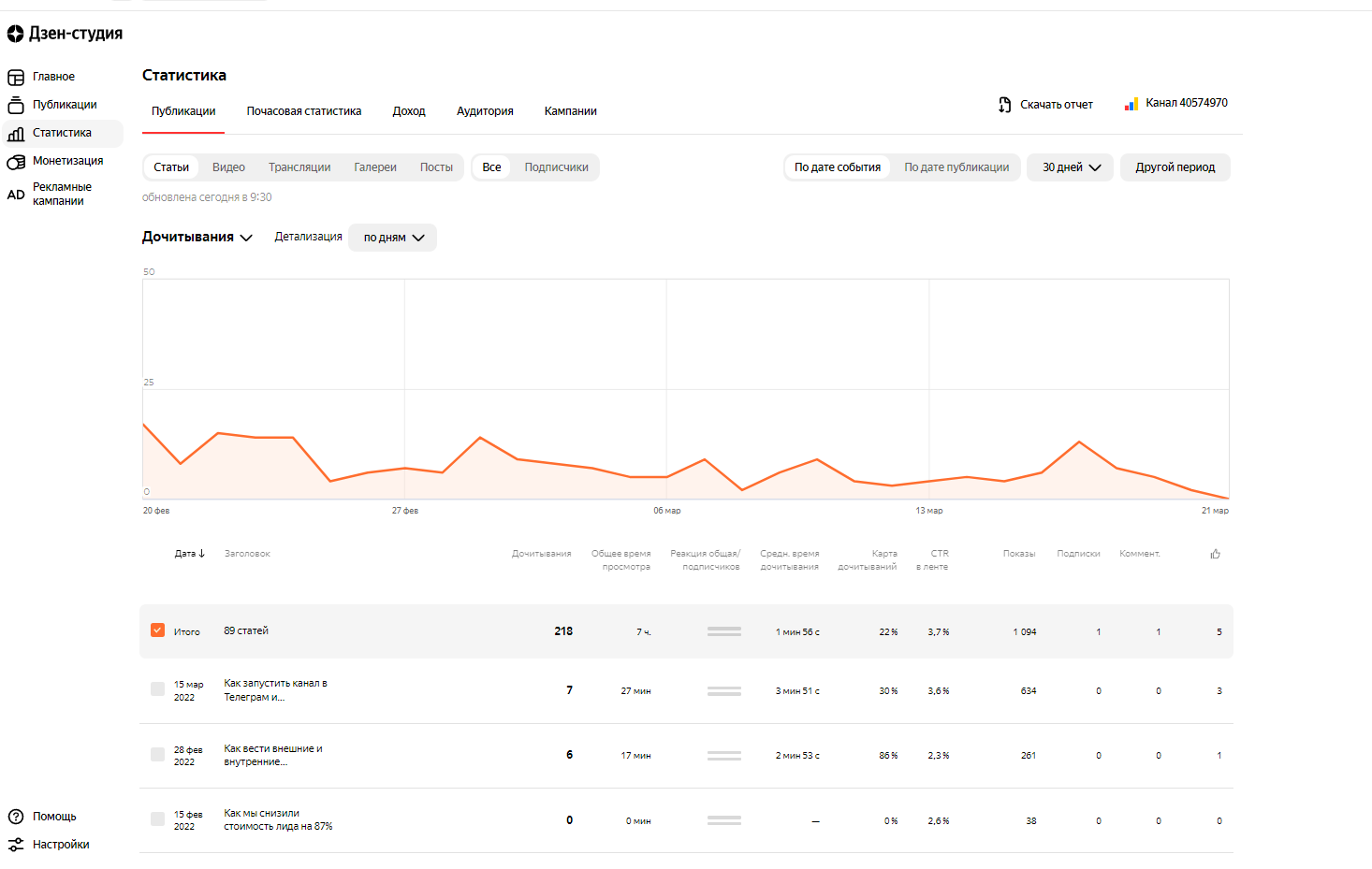 Первый показатель — это количество дочитываний. От количества напрямую зависит доход: чем больше читателей зайдет в публикацию, тем больше будет кликов по рекламе. В верхней строке показано общее количество дочитываний на канале. Автоматически статистика показывает дочитки за 3 месяца. Над статистикой есть строка с датами, где можно изменить период. Дополнительно построчно указано количество дочитываний к каждой публикации. Учитывайте, что статистика на старые статьи обновляется раз в сутки.