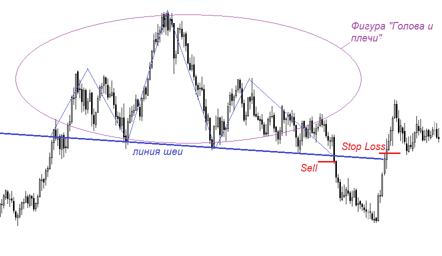 То же касается и других случаев. Допустим вы открыли позицию после завершения фигуры «Голова и плечи» (после того как очередная свеча закрылась ниже уровня шеи). В этом случае фигура потеряет весь свой смысл, если цена поднимется обратно за «линию шеи».