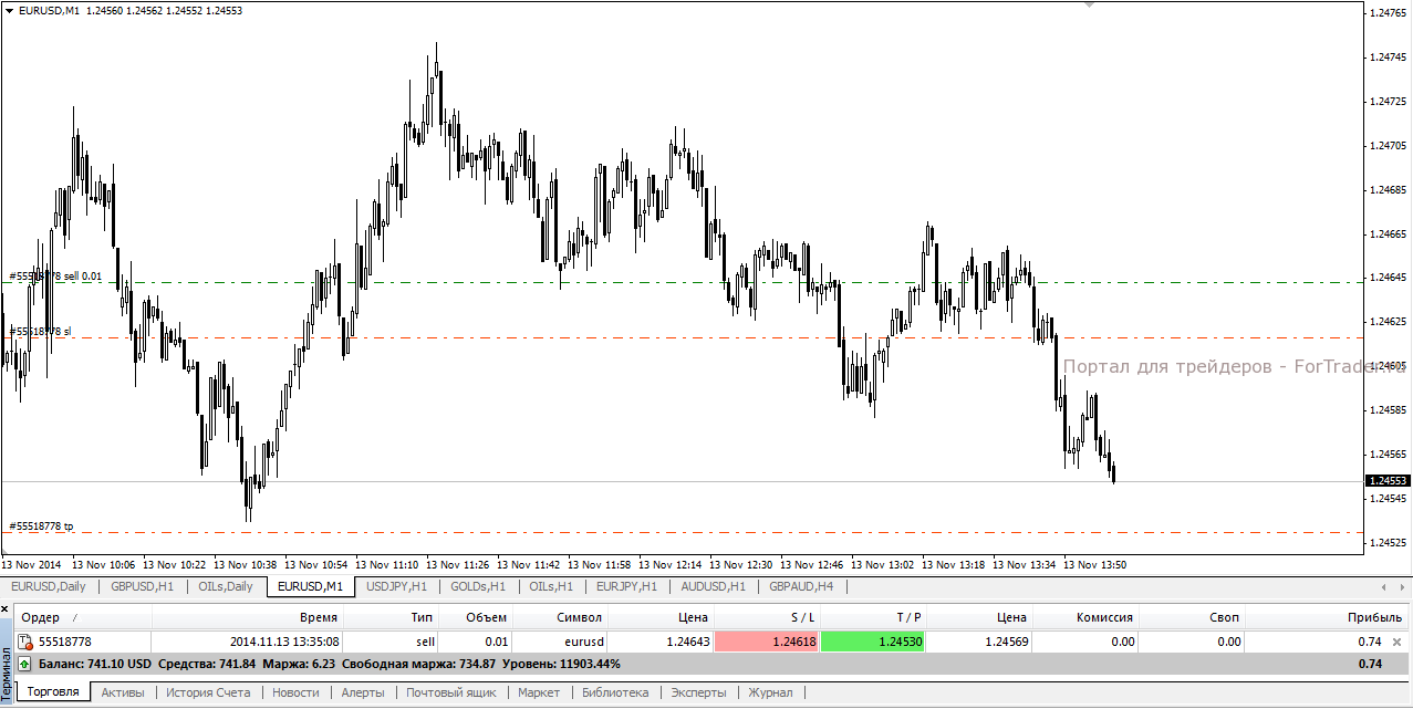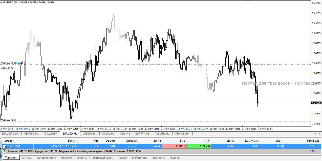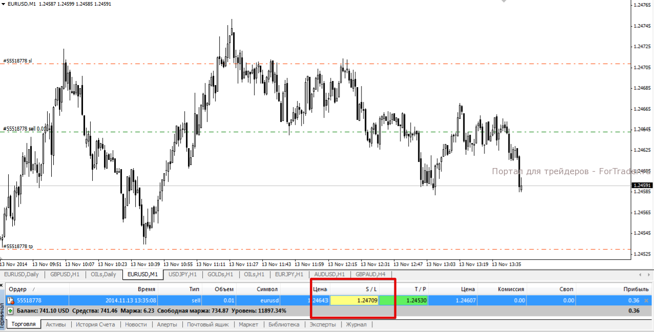 Проще говоря, трейлинг стоп на Forex тащит за собою ордер стоп-лосс на количество пунктов, указанное трейдером, за что на трейдерском сленге и получил наименование «трал». Например, на уровне 1,24643 открыта сделка на продажу по паре EUR/USD с тейк-профитом 1,24530 и стоп-лоссом 1,24709.