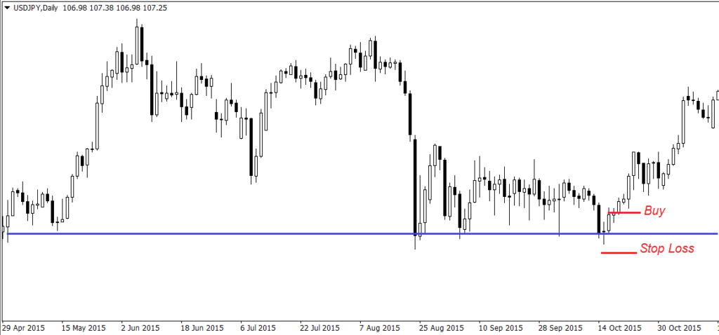 То есть, другими словами, если вы открыли позицию исходя из какого либо сигнала (паттерна, пробоя уровня и т.п.), то её не имеет никакого смысла держать после того, как этот сигнал окажется ложным. Например, если позиция была открыта после пробоя сильного уровня сопротивления, то какой смыс держать её после того как цена вновь откатится за этот уровень? В таком случае стоп-лосс рекомендуется устанавливать сразу за уровнем (на небольшом расстоянии, учитывающем текущую волатильность цены). Взгляните на рисунок ниже.