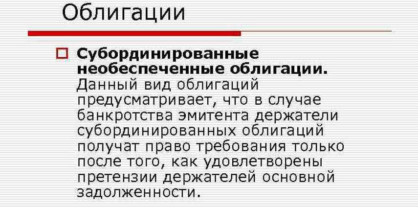 Сущность субординированных облигаций заключается в том, что их держатели получают права к определенным доходам и выплатам только после полного удовлетворения требований держателей первоочередных облигаций и других кредиторов.
