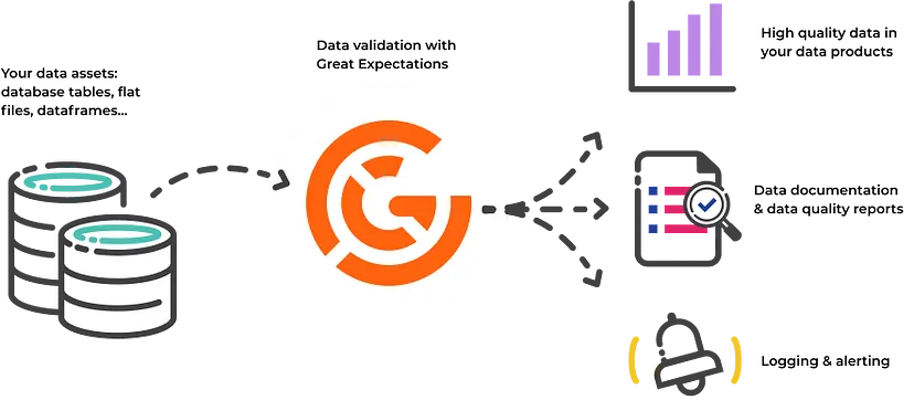 Great Expectations (GX) помогает группам обработки данных сформировать общее понимание своих данных с помощью качественного тестирования, документации и профилирования. Возлагая большие надежды, специалисты по обработке данных могут выразить то, чего они “ожидают” от своих данных, используя простые утверждения. Great Expectations обеспечивает поддержку различных серверных частей данных, таких как форматы файлов, базы данных SQL, фреймы данных Pandas и Sparks, а также поставляется со встроенной функцией уведомления и документирования данных.
